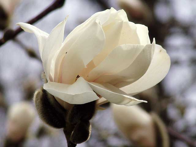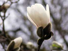 Die Blütenblätter einer Magnolie schieben sich aus der Knospenkapsel. |