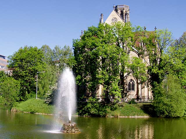 Die Johanneskirche ist ringsherum von Bäumen umgeben. |