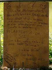 Am Zaun lehnt eine handgeschriebene Tafel. |