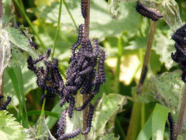 Hier war ich mir sicher, nun Raupen einer anderen Schmetterlingsart entdeckt zu haben, aber auch sie stammen vom Tagpfauenauge. |